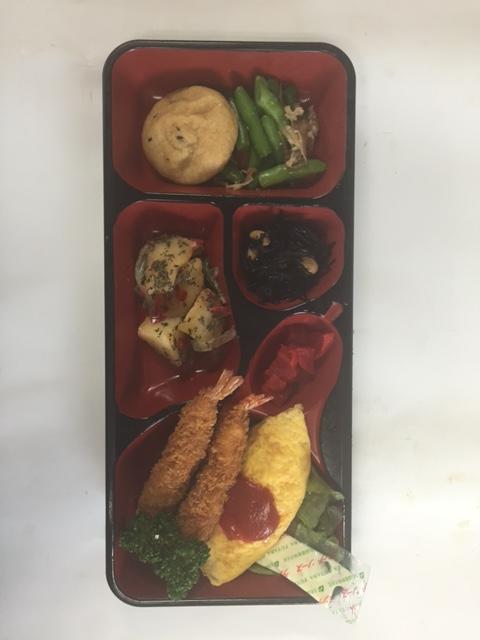エビフライ に チキンオムレツ と じゃがいもバジルオイル炒め