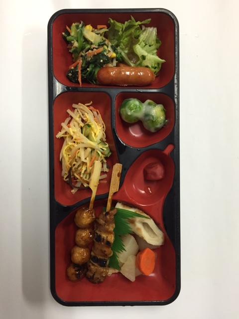 焼き鳥つくね、ネギ間串 と 菜の花のピーナッツ和え