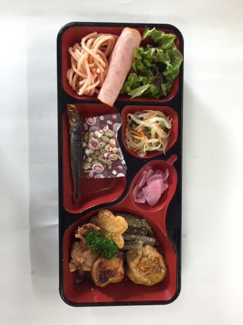 鶏肉の照り焼き に 小えびと里芋の揚げ団子 と 明太子スパゲッティ(福豆、いわし焼き付き)