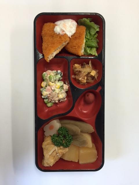 玉子巾着 に 大根煮 と 白身魚のフライ